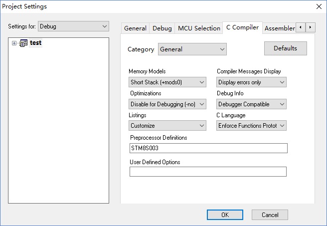 选择目标器件。点击“Project->Settings”,在弹出的窗口中点击“C Compiler”选项卡,在“Preprocessor Definitions”一栏填入微控制器型号,例如“STM8S003”。