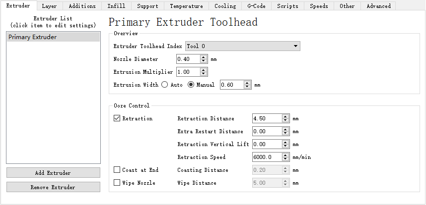 回抽长度:挤出机反转,将耗材从喷嘴里抽出的距离。近程挤出一般设1-3mm,远程挤出一般设4-8mm。如果喷头空走时拉丝漏料比较多,可适当增加回抽长度,具体数值需要自己根据打印机和耗材性能进行测试。